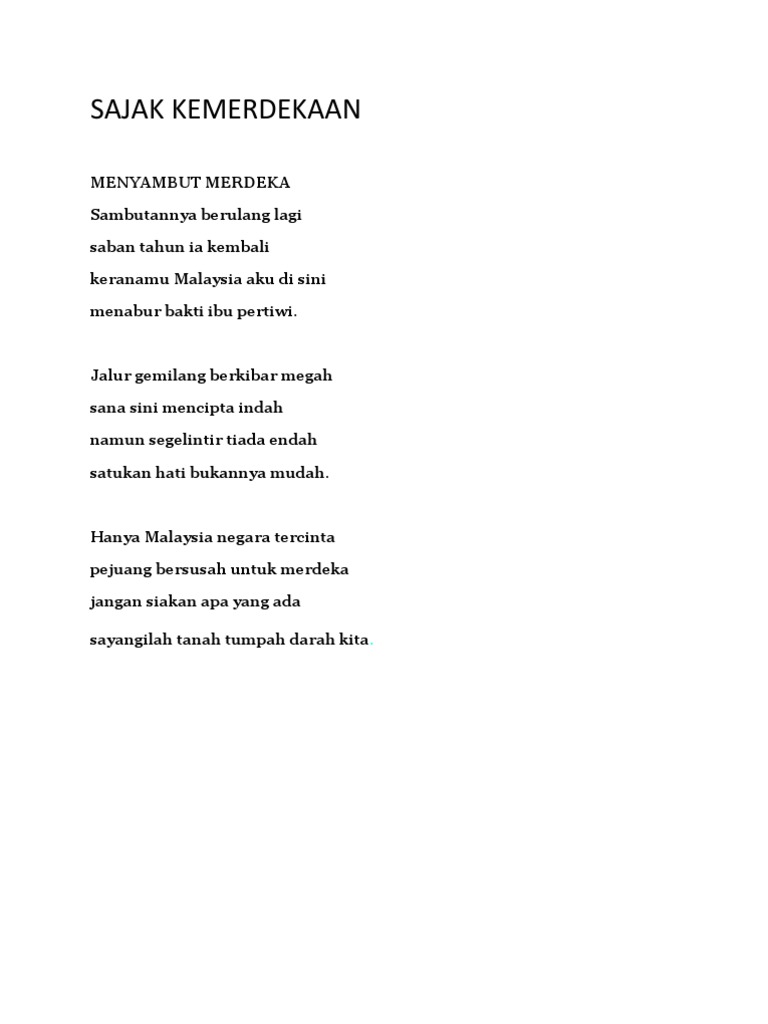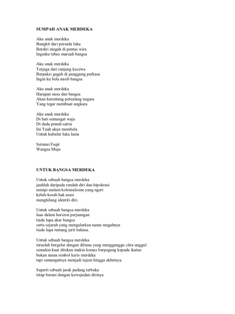 Erti Kemerdekaan karya A. Kepada insan seikat masyarakat. Sajak Merdeka Perhatikan negara yang huru-hara Palestin Iraq dan Cambodia Kita haruslah menjaga maruah Negara kita yang tercinta.